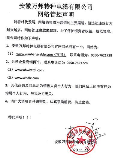 鄭重聲明:安徽萬邦特種電纜有限公司官方網站為:www_wanbangcable_com.1pgw.com,除此之外無任何子網站或合作網站,其余均為假冒偽劣。電話:0550-7621728 13485756353 地 址:安徽省天長市滁州高新技術產業開發區經四路29號